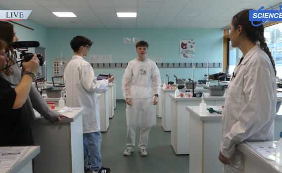 Une équipe de télévision visite le laboratoire de l'IRS où les journalistes sont accueillis par une scientifique qui leur présente les expériences menées en passant de salle en salle.